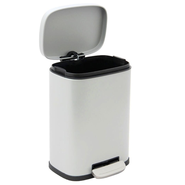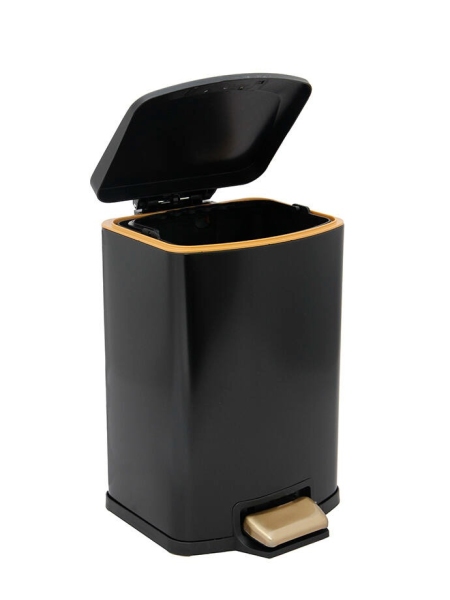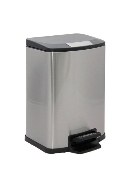 Cesto rectangular con acabado metálico. Con pedal de sistema cierra suave. Medidas: 21,5x18,5x30 cm.