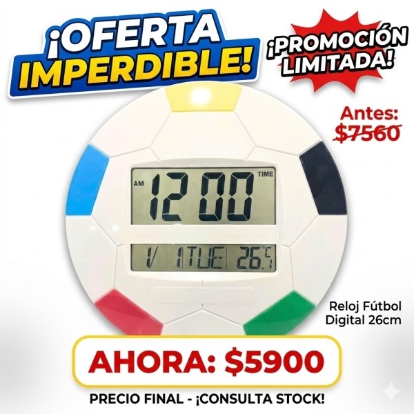 RELOJ PARED O REPISA - PELOTA DE FUTBOL - DIGITAL - 26CM